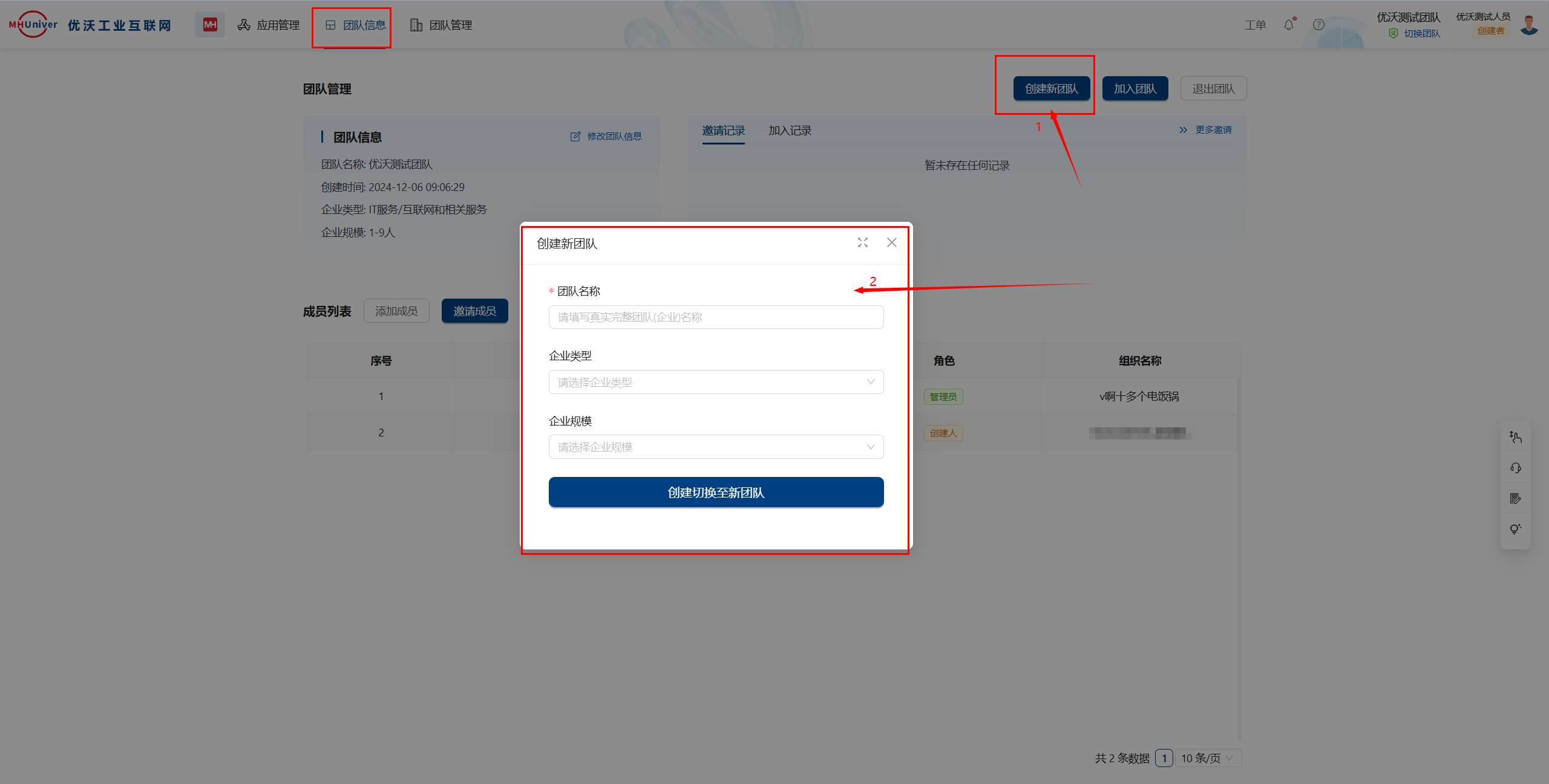 点击创建新团队,填写团队名称,选择企业类型、企业规模,点击创建切换至新团队