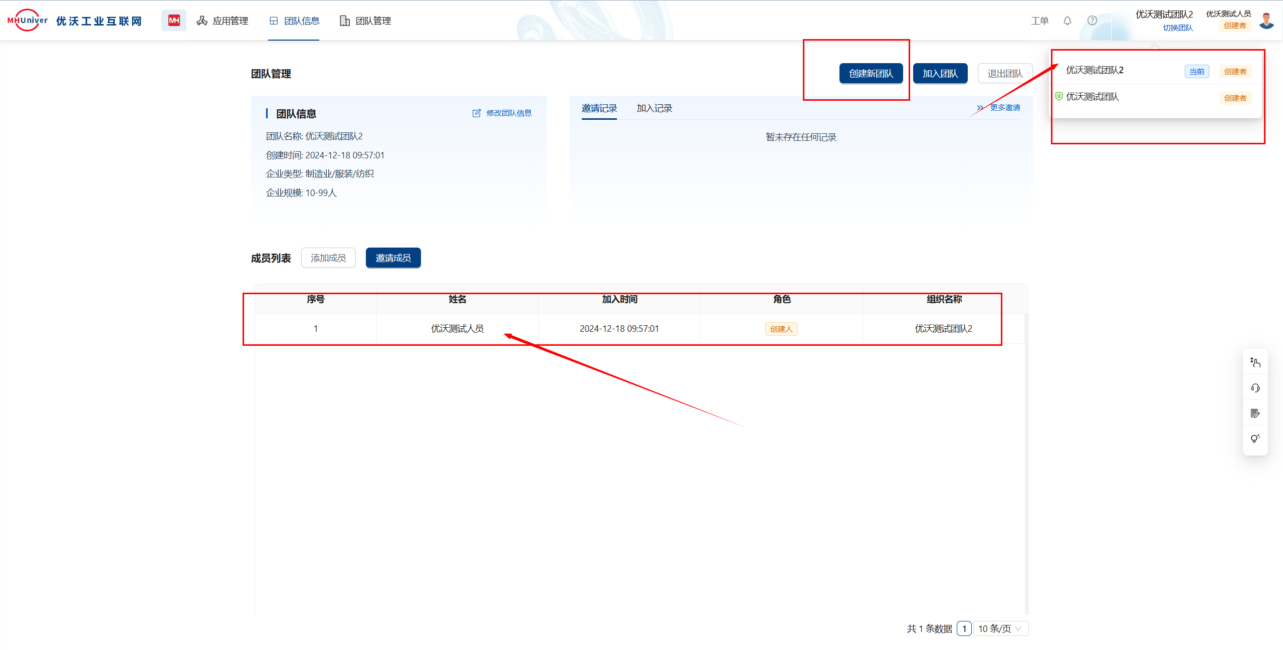 创建团队后,可以看到多个团队,选择切换,则会切换到对应团队