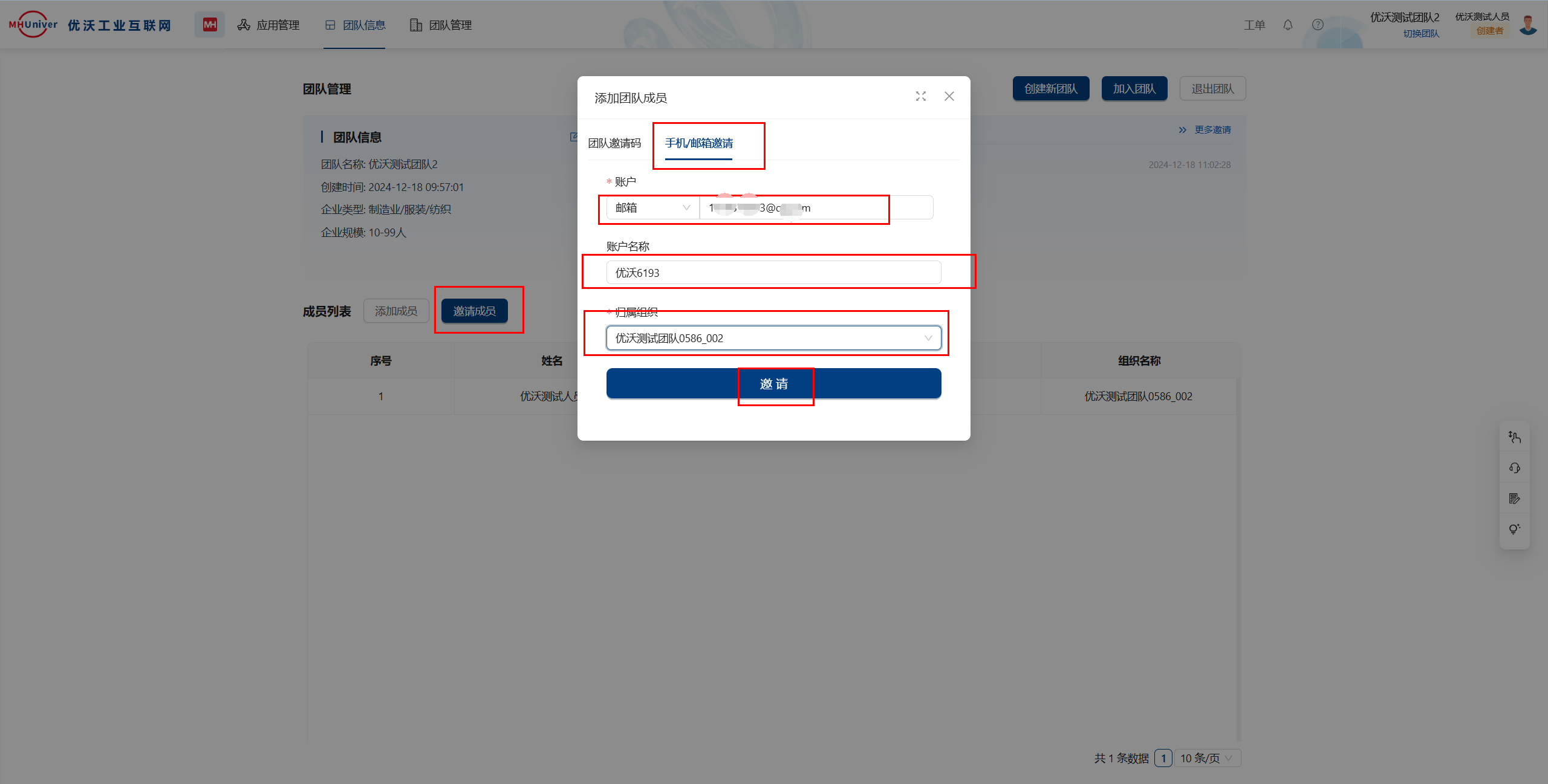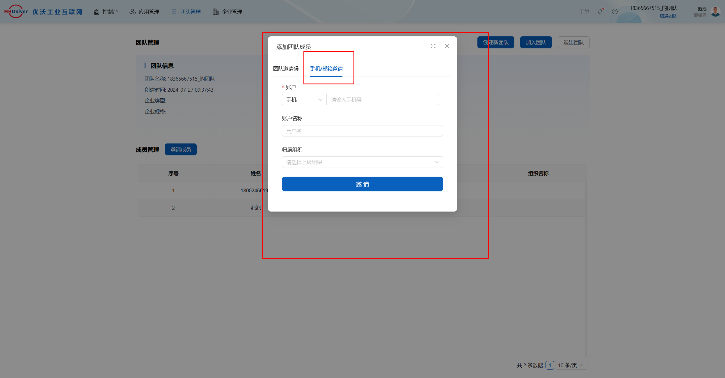 2)通过手机/邮件邀请,填写要邀请的成员的手机号或者邮箱、账户名称、归属组织,点击邀请,邀请成功后被邀请的成员会收到短信或邮件,点击短信或邮件中的链接,即可进入系统中加入团队,如何加入详情请见前文“加入团队”