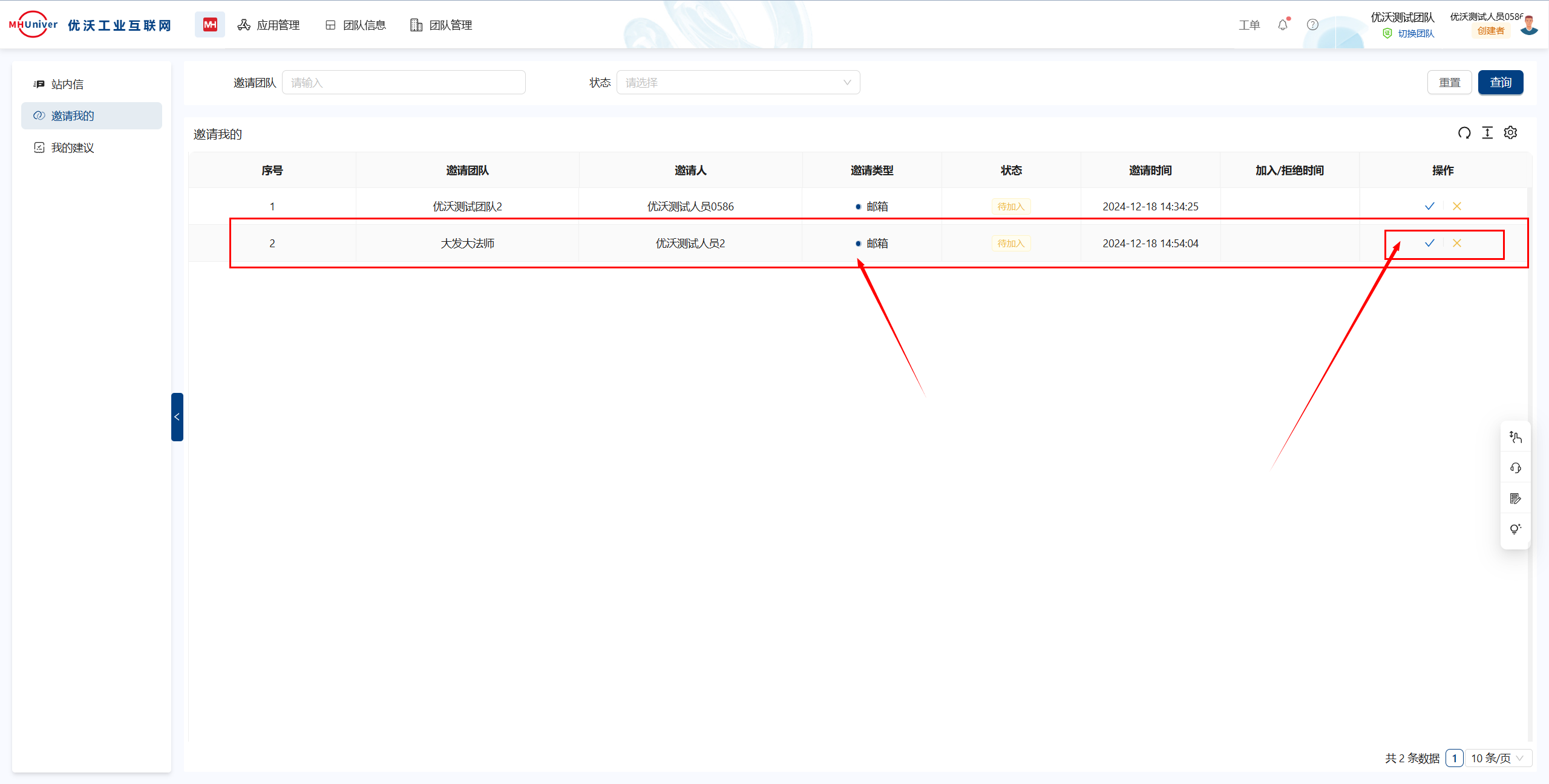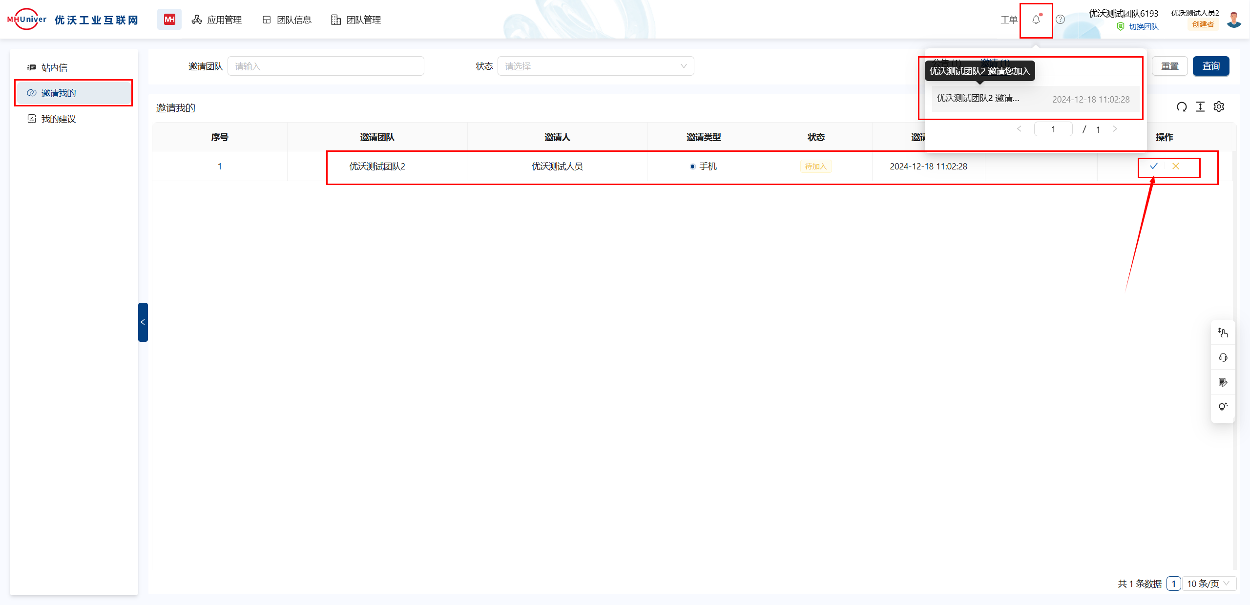 系统邀请:邀请通知,点击接受加入团队,点击拒绝则不加入