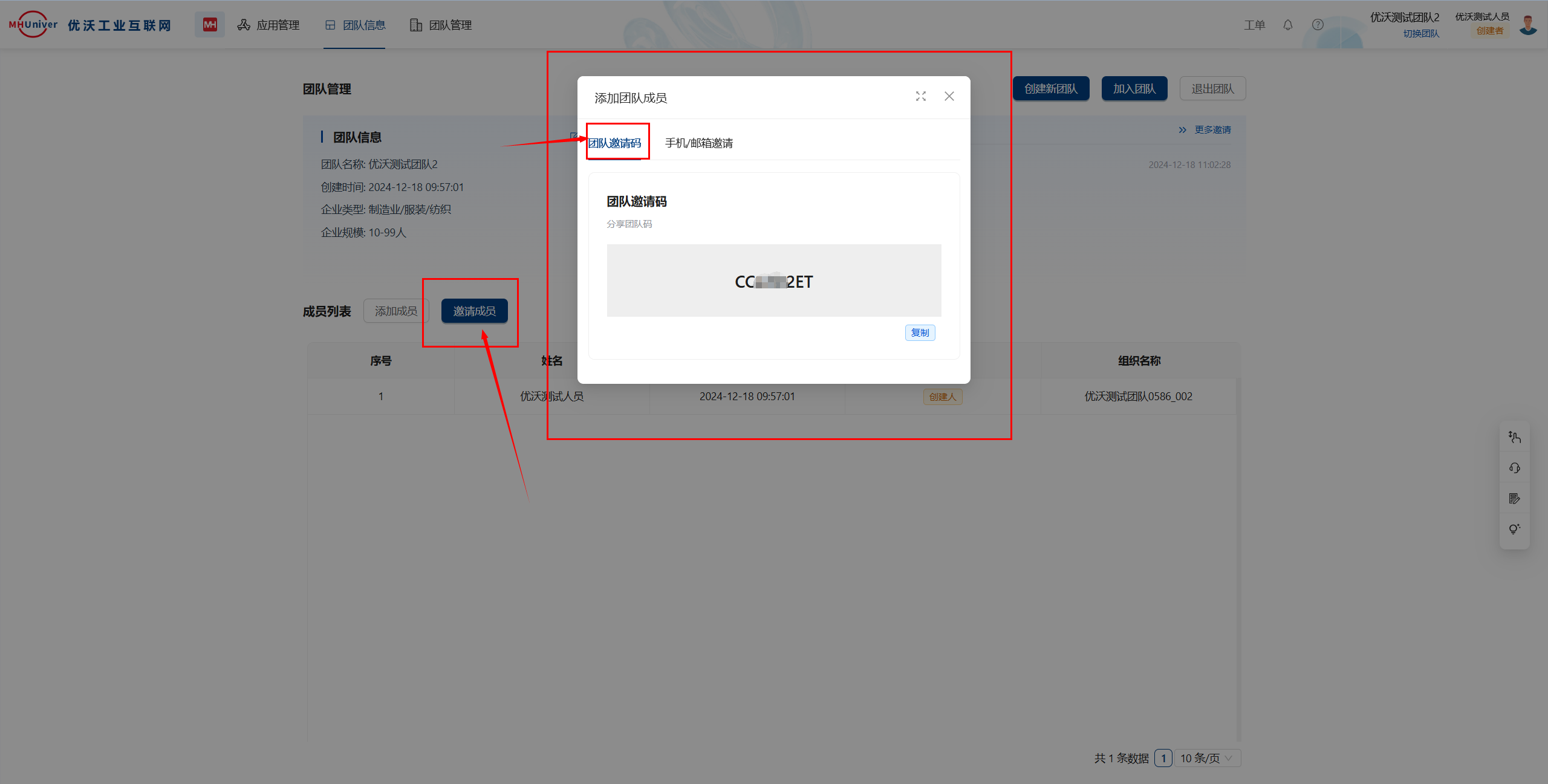 (1)通过受邀码被邀请加入团队 团队邀请码在邀请加入中查看,复制给受邀对象