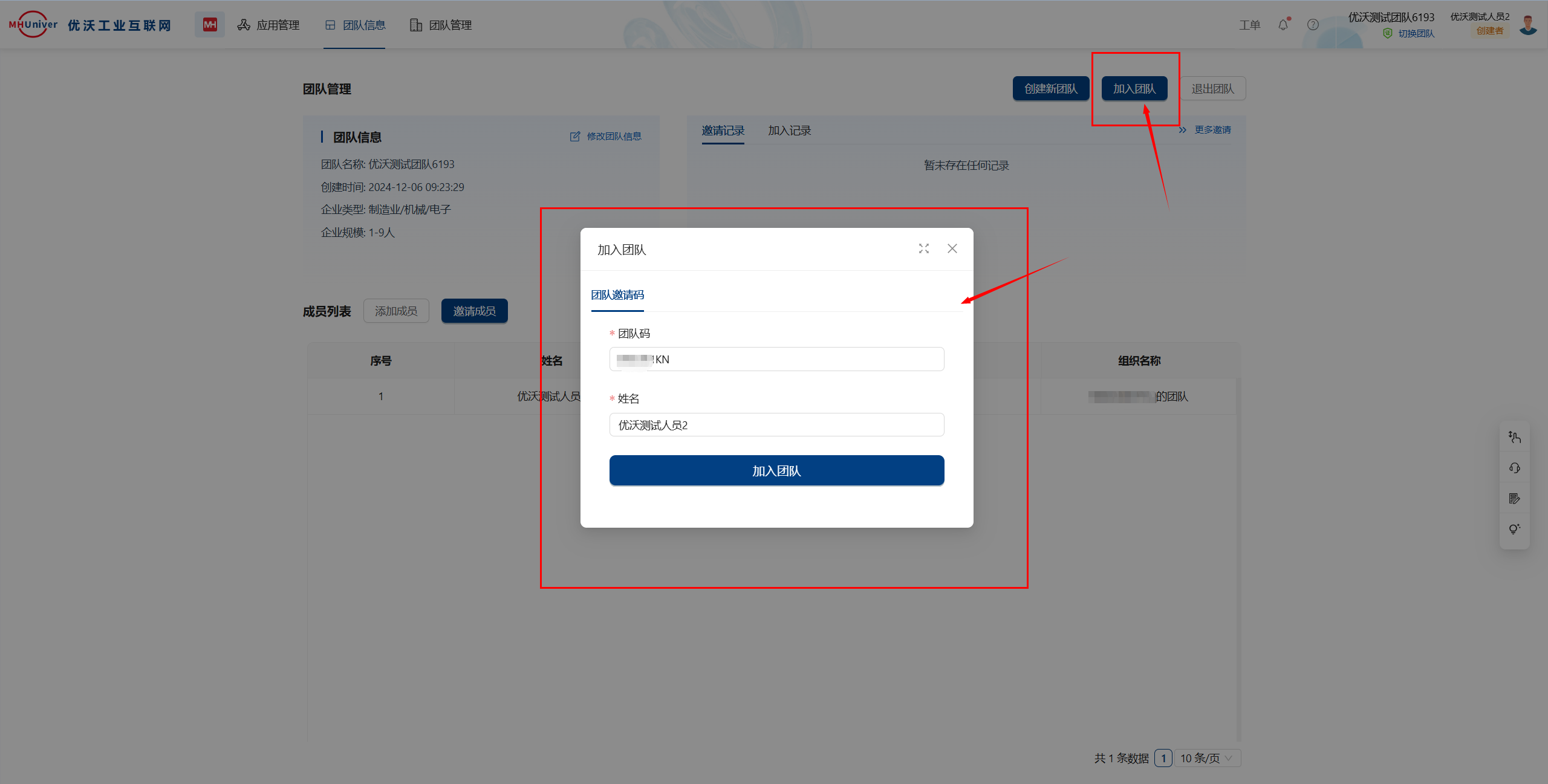 受邀对象点击加入团队,填写团队邀请码及姓名,点击加入