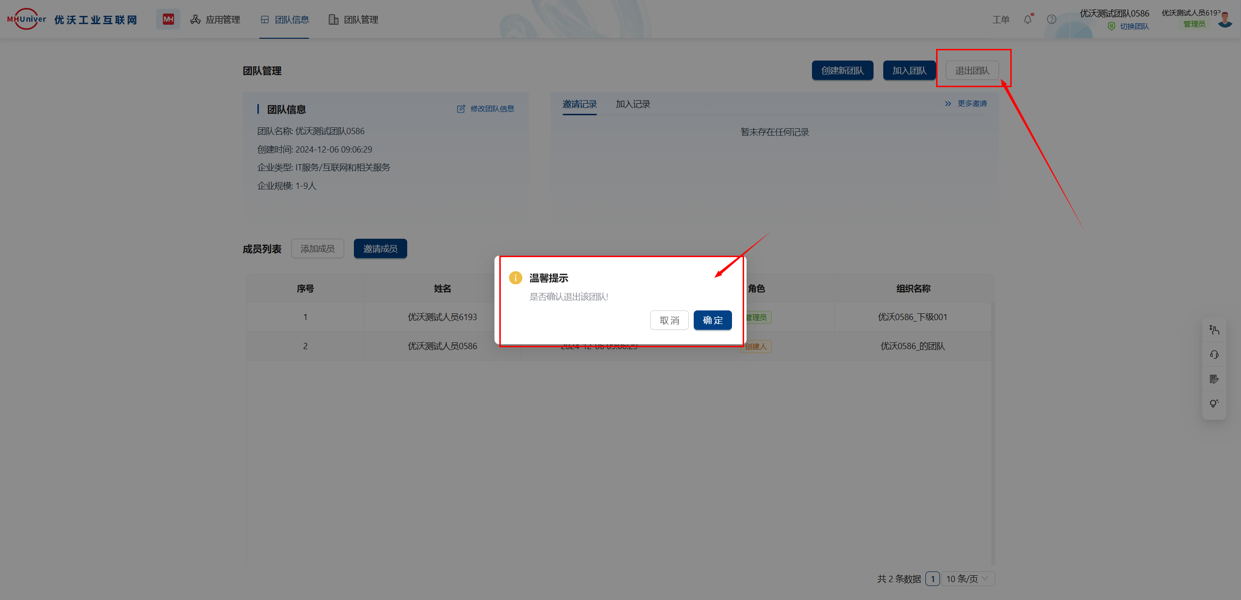若不是团队的创建者点击退出团队,则弹出提示,点击确定,退出成功