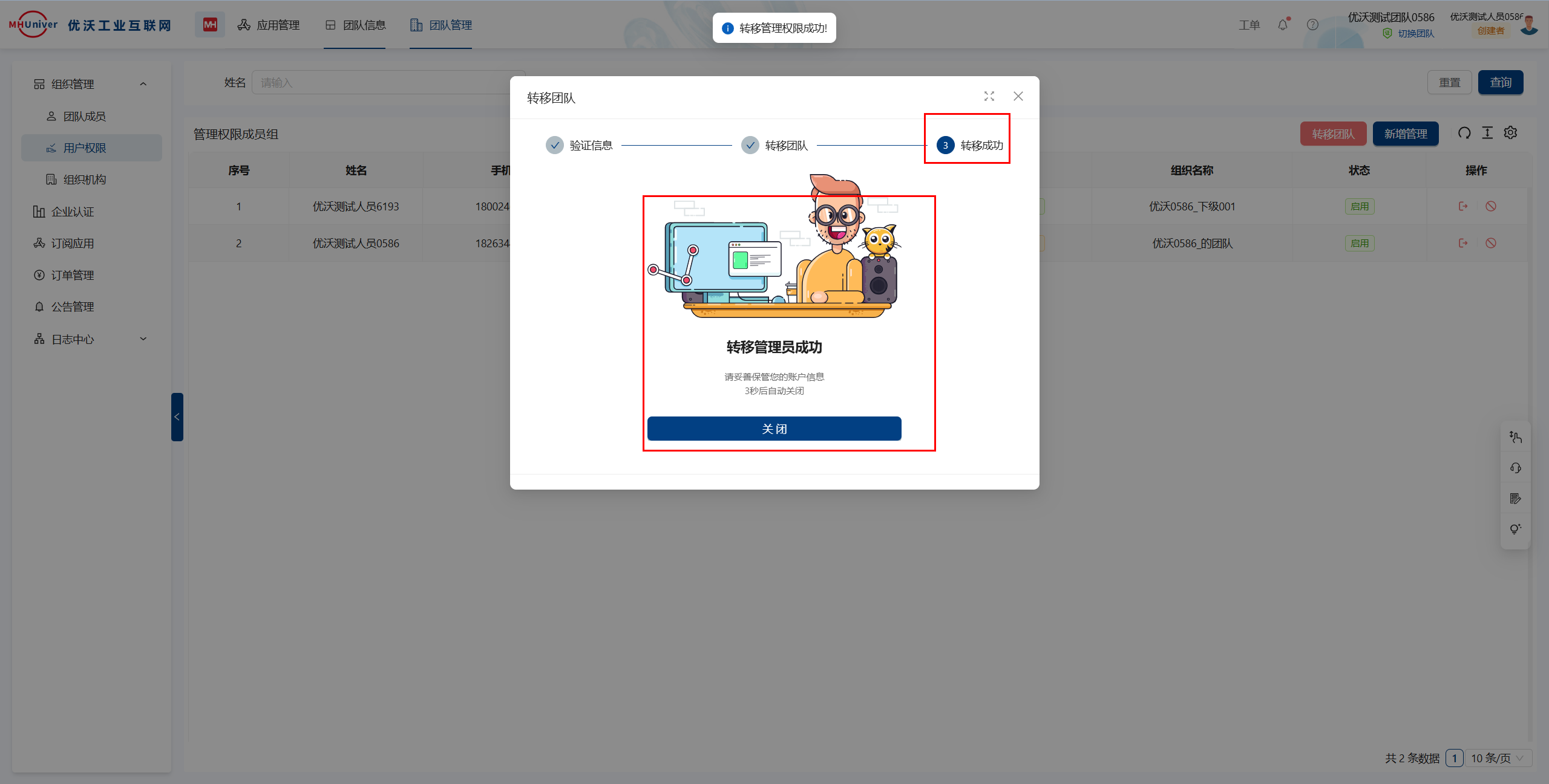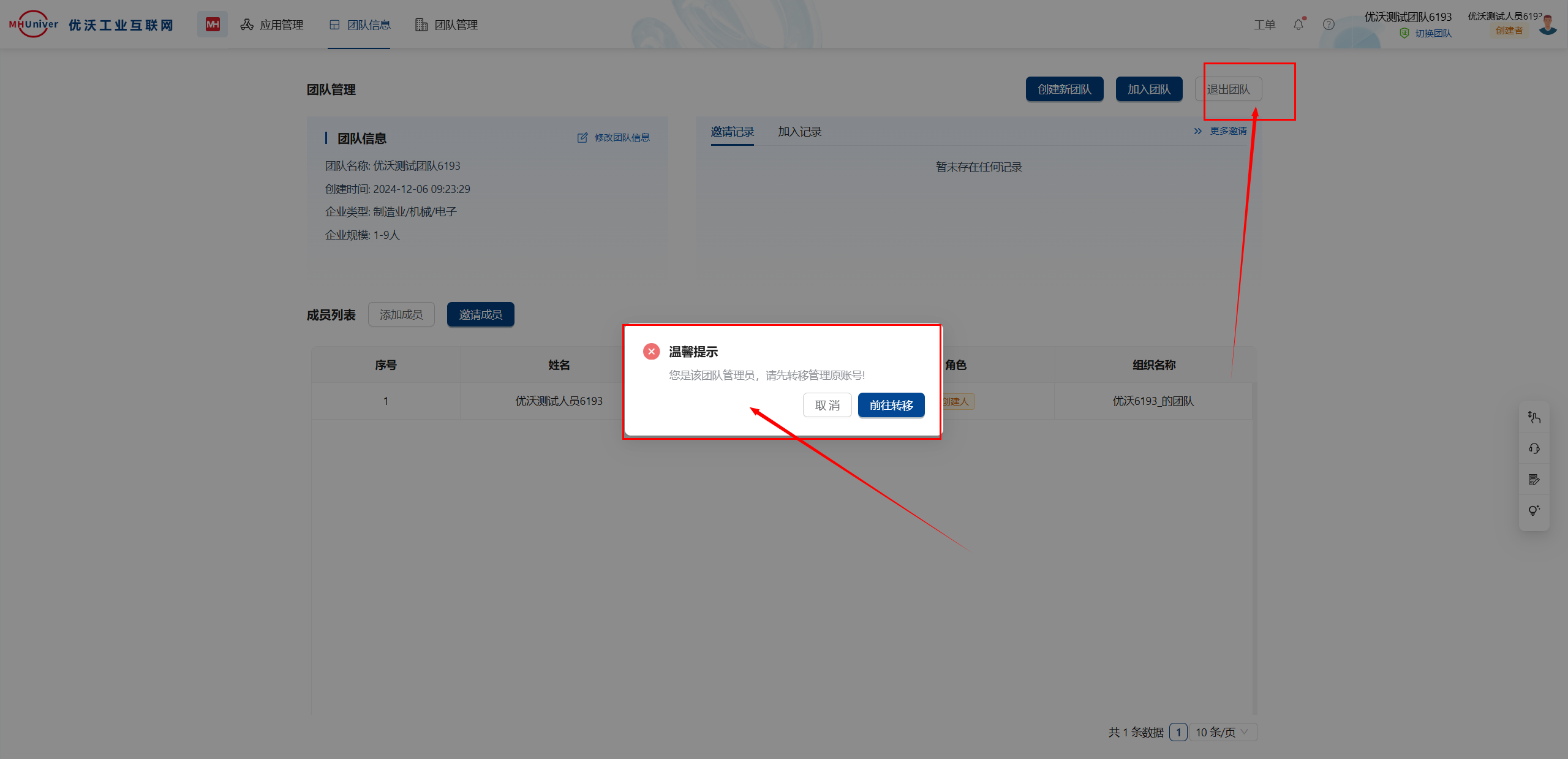 转移团队成功后,即刻返回团队信息页面,选择退出团队