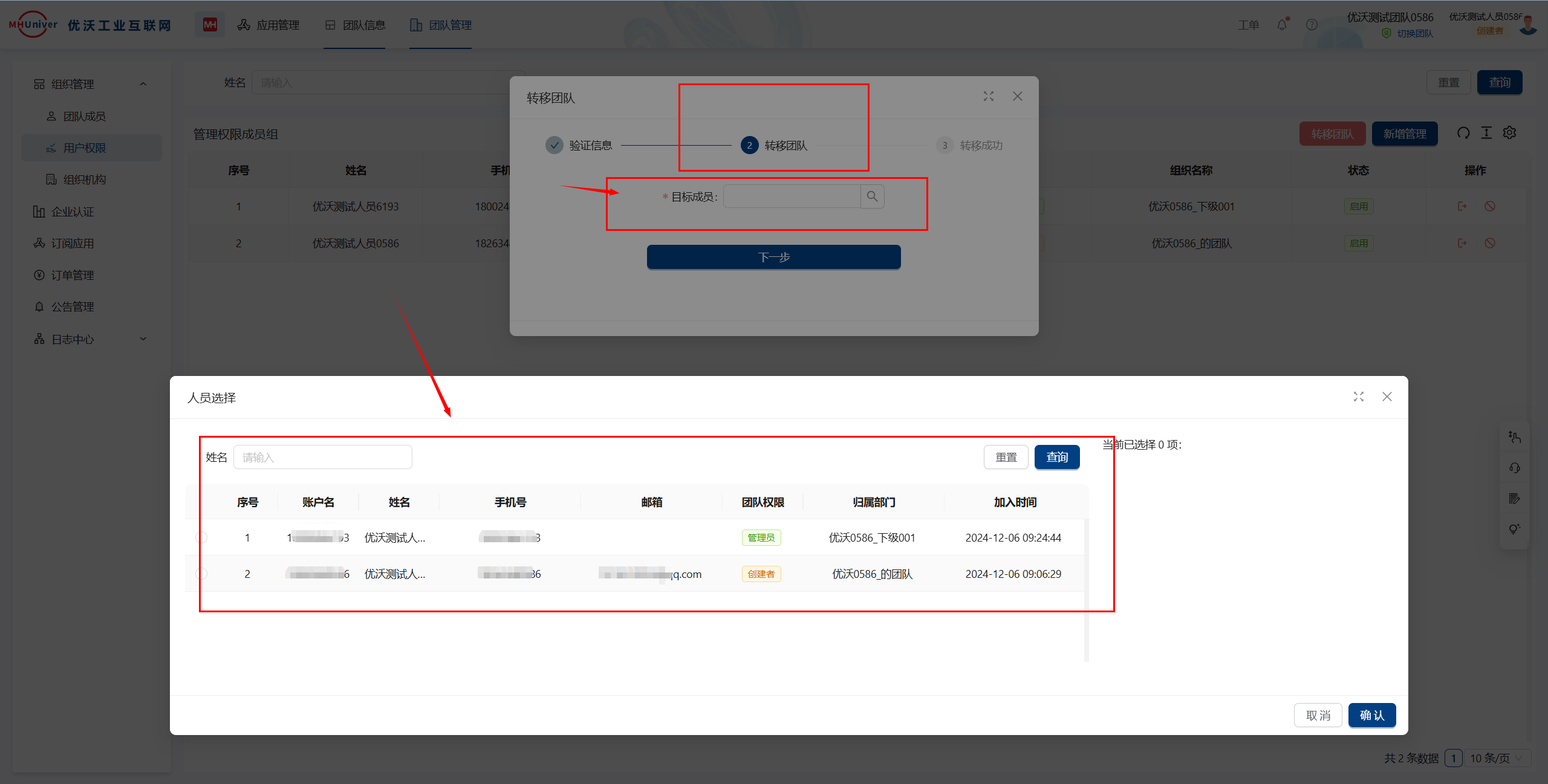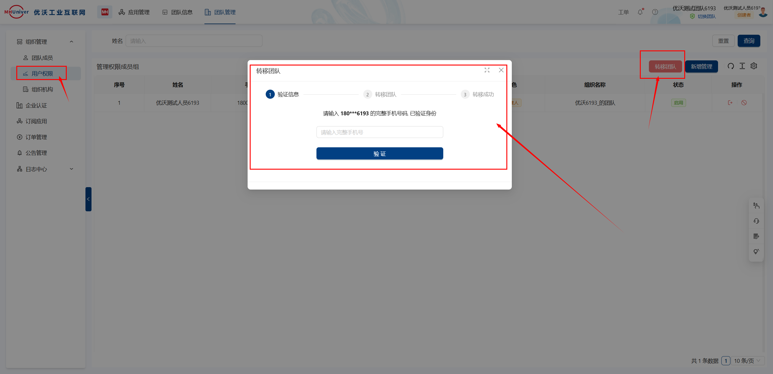 若是团队的创建者点击退出团队,则弹出提示需要转移团队,通过验证准确手机号及验证码后,将团队转移给其他成员