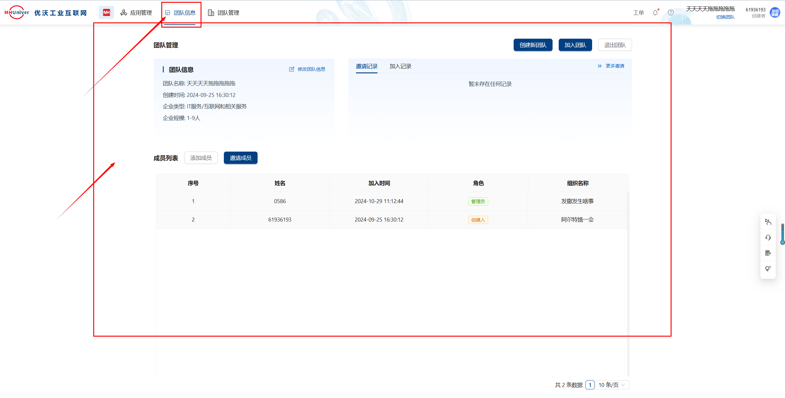 点击团队信息,进入团队信息管理页面